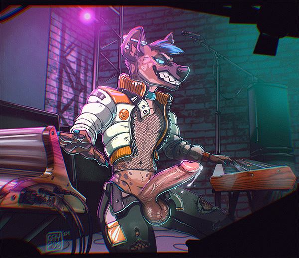 As you tread into the back hallway, you can see he hasn’t wasted any time. He’s sat right next to the stage entrance with his fly flopped open. He’s already slathered his dick in lube, pumping his hand over the head of his cut cock, then down to his balls. It’s actually… Impressively long? He could damn near flop it against his chest, and that length meant those strokes were long too, fingers gliding over every inch tantalisingly. He huffs, giving a pleased rumble when he sees you enter, and the hyena’s cock visibly stiffens in reaction to you.