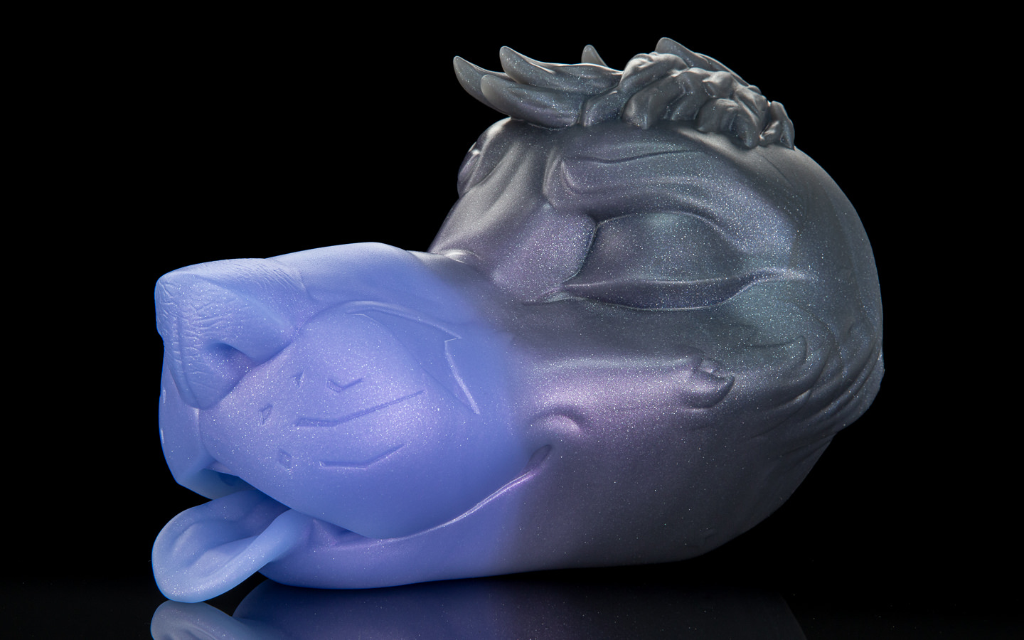 Lucy's classic wine-red to dark fade, shimmering with hellish sparkles! Her tongue and nose both in UV reactive pink!