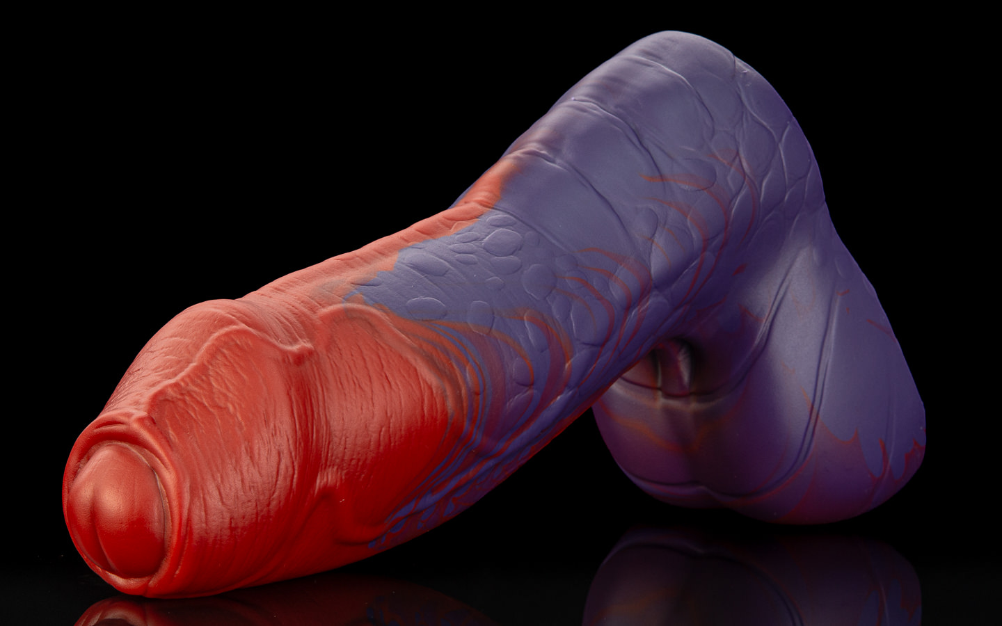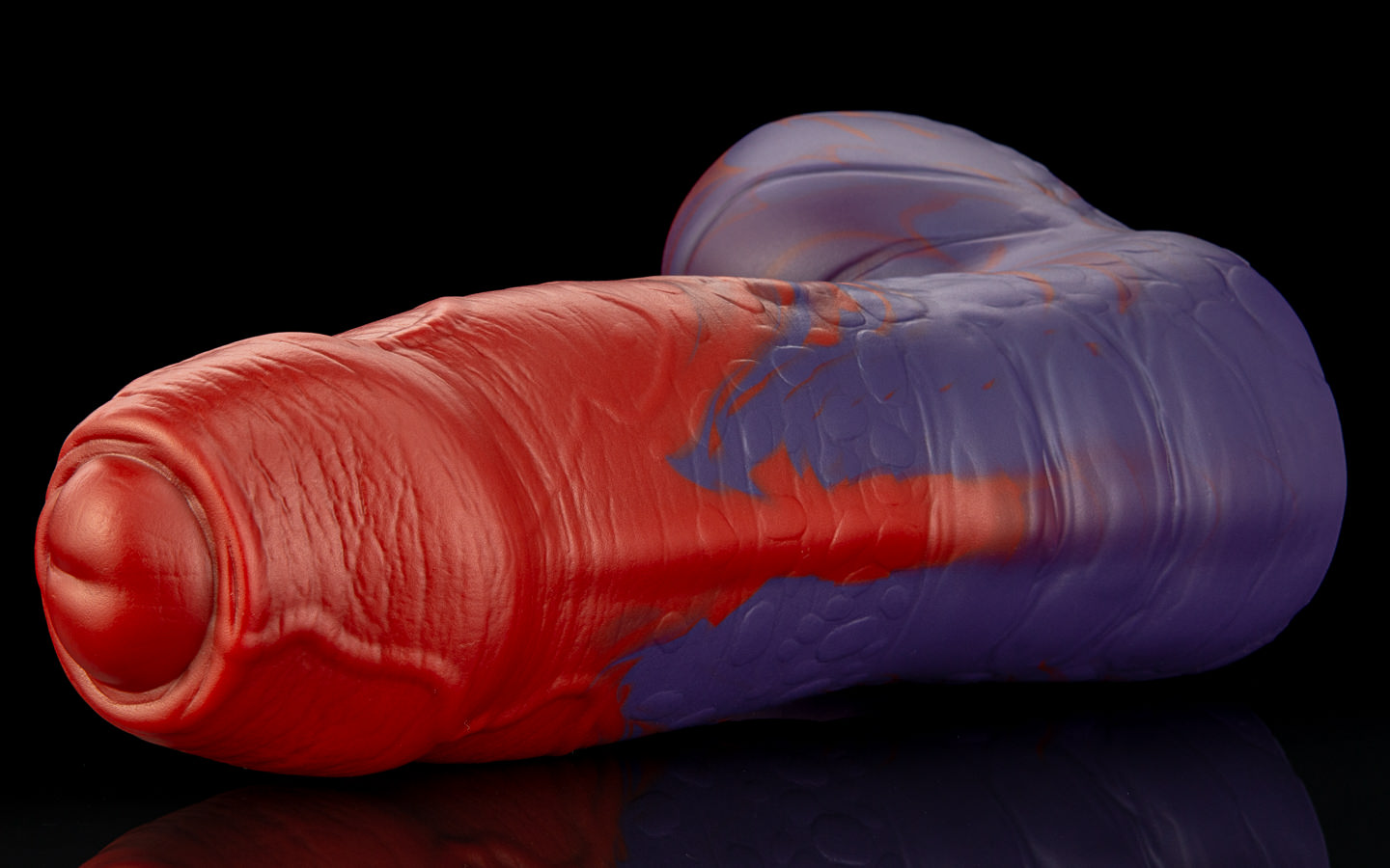 The wrinkles then transition to a scaled texture further down, making him more interesting to explore when hilted; his plated balls make a good place to sit once you’re at the bottom!