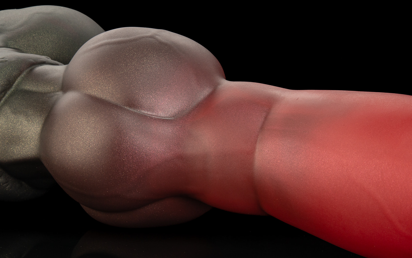 His signature toy fades from a vivid, gently sparkling crimson to a gold-mica'd black base. It looks stunning in person.